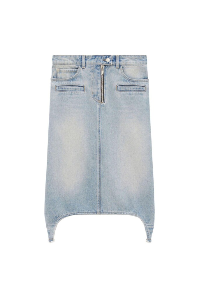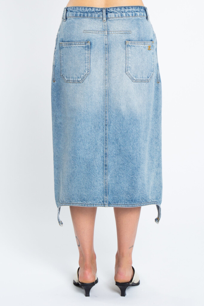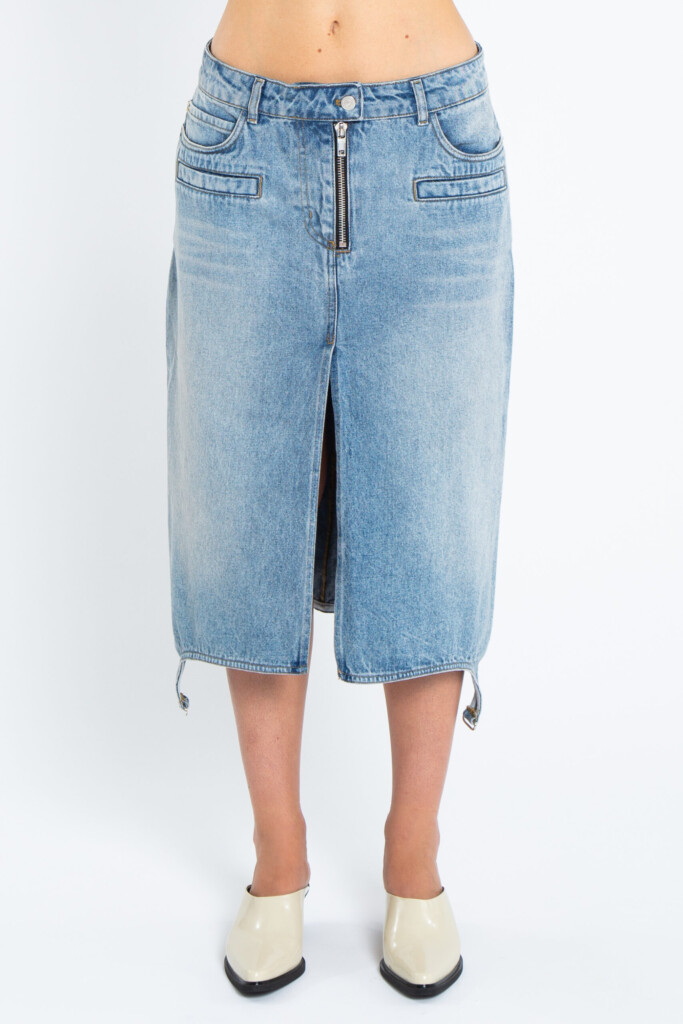 blu chiaro cotone denim con effetto schiarito chiusura con bottoni design classico a cinque tasche due tasche a filetto frontali lunghezza sotto al ginocchio linguette laterali con fibbia
