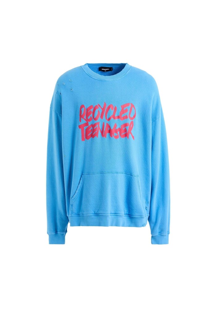 french terry, effetto vissuto, tinta unita con stampa, senza applicazioni, girocollo, maniche lunghe, tasca a canguro.