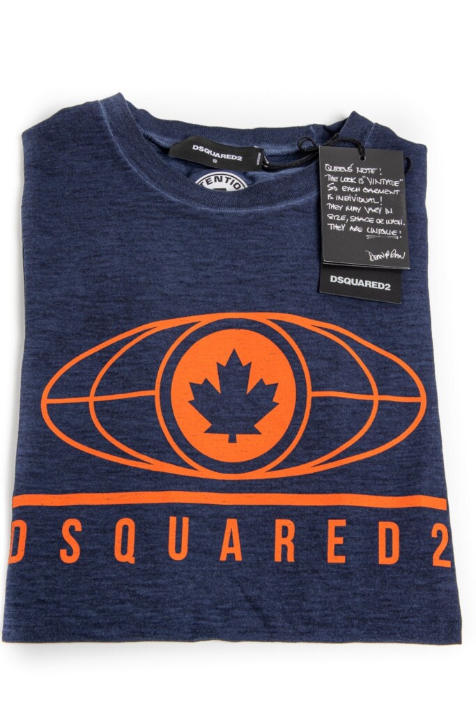 Dsquared2 presenta questa maglietta in un blu scuro, la parte che spicca maggiormente รจ il particolare logo accostato dalla scritta Dsquared2, in arancione, al centro della maglia.