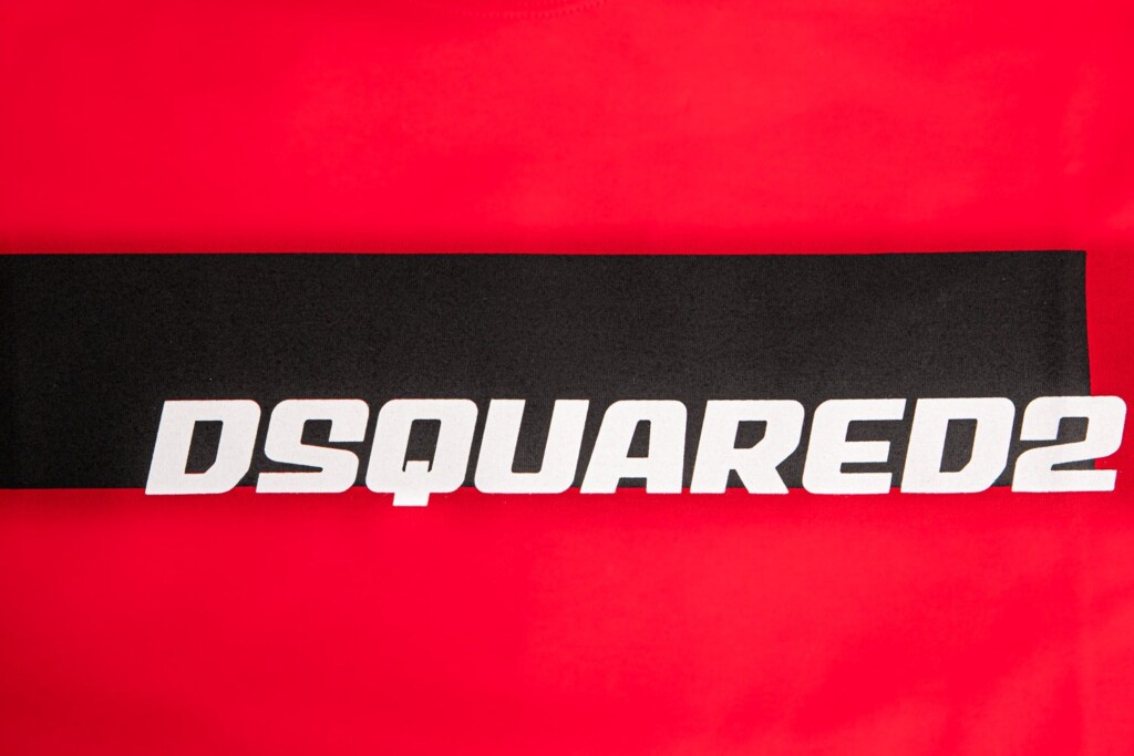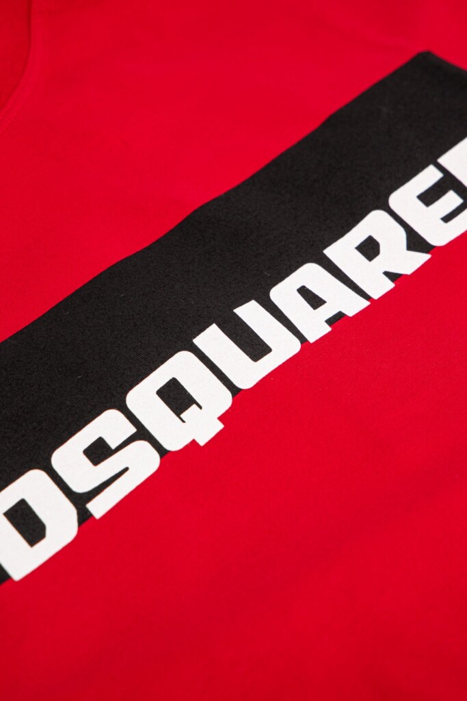 La T-Shirt in colore rosso possiede una fascia nera al centro, dentro ad essa รจ stampata la scritta Dsquared2 in bianco a caratteri cubitali.