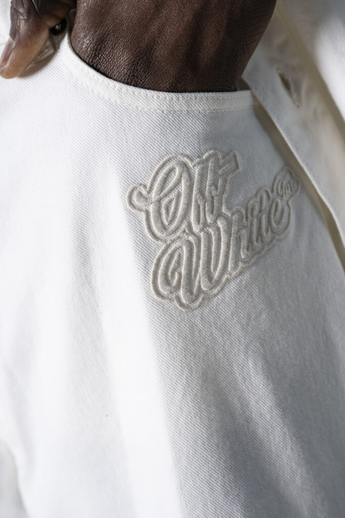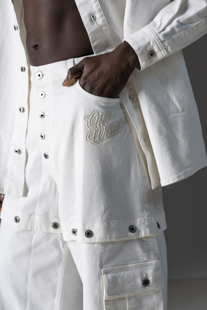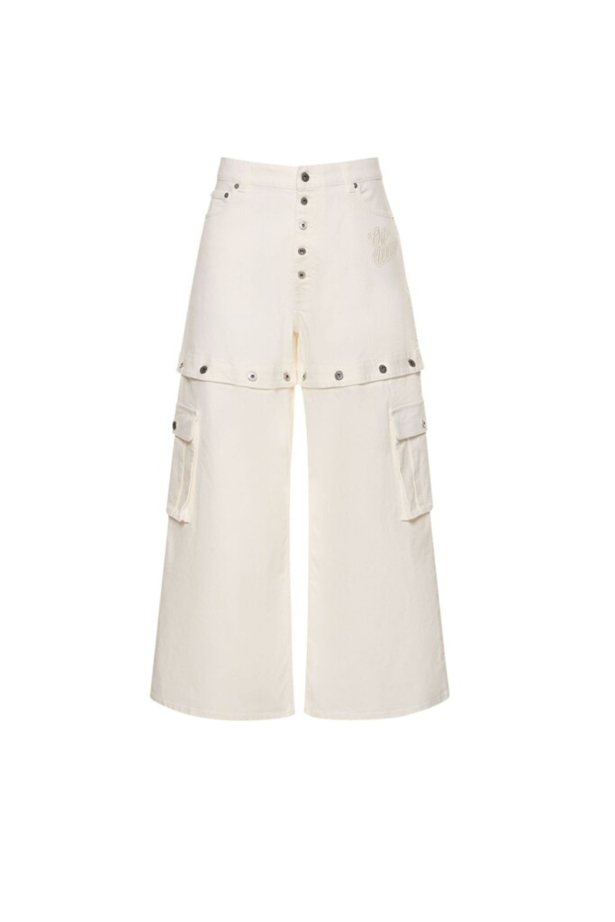 Jeans a cinque tasche di Off-White realizzati in denim di cotone stretch con logo 90’s ricamato in tono sul davanti, caratterizzati da un design convertibile in bermuda tramite bottoni sulle cosce. Chiusura con bottoni logati a vista, passanti per cintura e jacron in pelle sul retro della vita.