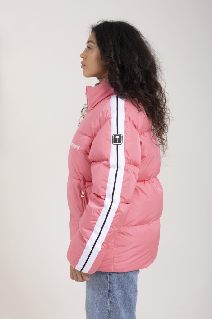 Piumino trapuntato di Palm Angels in nylon rosa, caratterizzato collo alto, chiusura frontale con zip, maniche lunghe con bande a contrasto bianche, ricamo palma sulla manica, polsini elasticizzati, ricamo logo a contrasto sul petto e tasche laterali con zip.