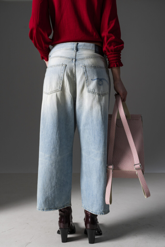 Jeans a cinque tasche larghi e cropped con pinces sulle ginocchia, realizzati in denim italiano di medio peso con un lavaggio vintage morbido e leggero.