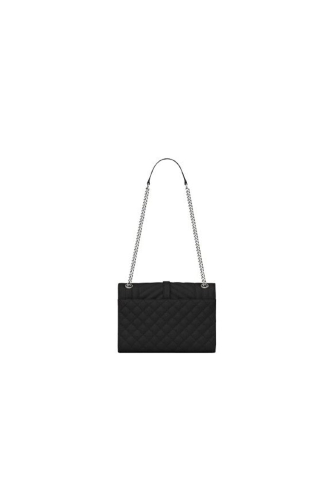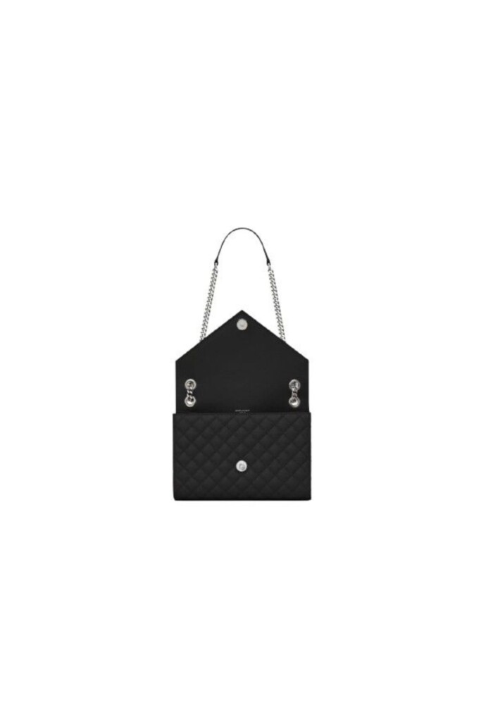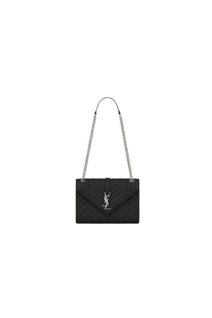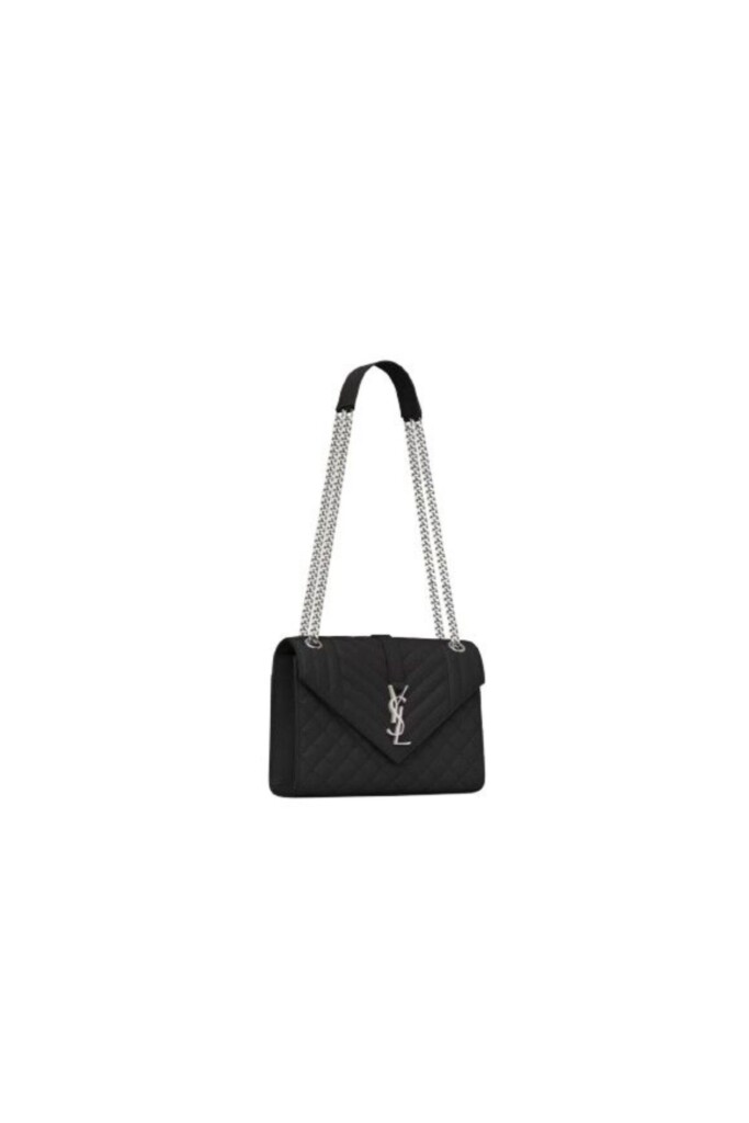 Tracolla ‘Envelope’ di Saint Laurent, media in pelle grain de poudre, dettaglio logo metallico su chiusura flap YSL, tasca sul retro, tracolla in catena e pelle.